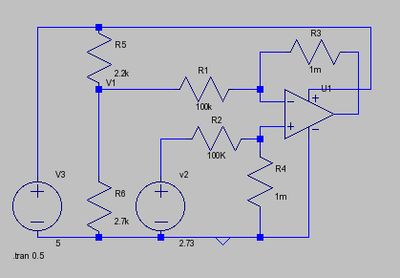 I decided that I wanted to have a 0-40'C range. So, we need to shift the level such that around 0'C (2.73v) is seen as zero. Then we want to amplify anything above this by 10, such that each tenth of a degree is 10mV, and each degree is 0.1V. To do this, we need to use a differencing amplifier with a gain of 10. The following circuit was created in LTSpice to test the parameters before actual construction.